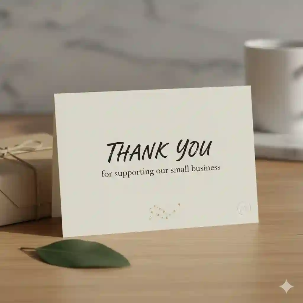 Tidak semua thank you card harus berukuran besar. Ukuran sederhana seperti A6 atau postcard sudah cukup, asalkan desain tertata rapi dan pesan tersampaikan dengan jelas.